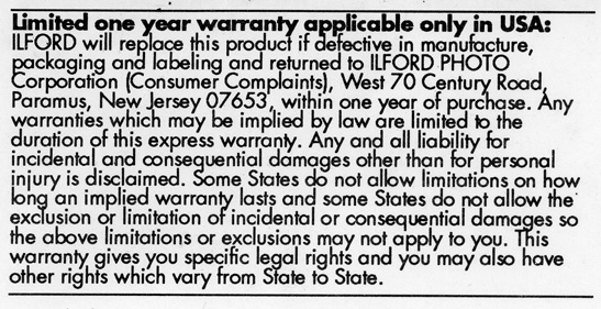 LIMITED ONE YEAR WARRANTY, Ilford Ltd., found in a box of the SP737T film above.