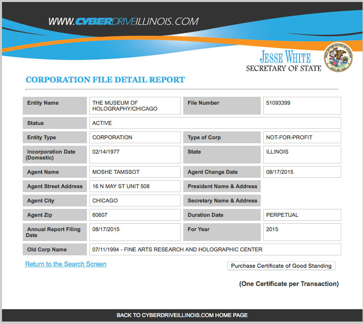 Moshe's most audacious act, and one that made my heart skip a beat, was when he reinstated himself as the head poobah of the Fine Arts Research and Holographic Center with the Secretary of State of Illinois. He was excited to announce on August 17th, 2015, that he has "successfully resurrected the ORIGINAL Museum of Holography, Not-For-Profit, corporate entity. Long live the Museum of Holography!" (from slack.com) He can claim being the president of the board since 2008, as he paid the fees to the Secretary of State of Illinois from the last time Loren did to the present.