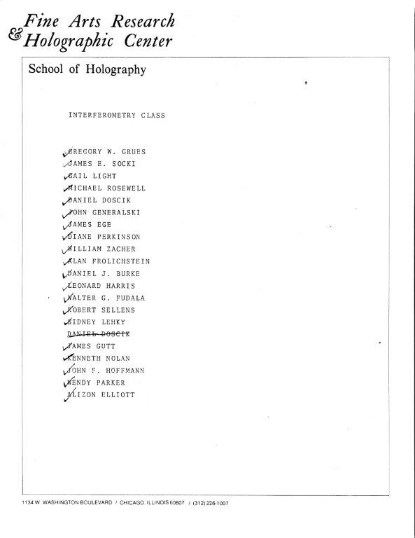 Their friend, Harold Haydon, Chicago Sun-Times Art Writer, on Friday October 6th, 1978, quoted Loren Billings in an article named "Wedding of science and art" claiming that "Actually, it is the first school of holography in the world." She must not have read Lon Moore's (down as one of their faculty in the brochure) transcript from Lloyd Cross's School of Holography in San Francisco, which opened in October 1971, and Lon was Lloyd's first student.