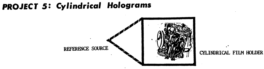 <Introduction> <Equipment> <The Big Beam> <Project 1a: In-line "Gabor" type Holograms> < Project 1b: Off-Axis Holograms> < Project 2: Single Beam Transmission Deep Scene Hologram> <Project 3: Division of Amplitude Hologram> <Project 4: Pseudo-Achromat Transfer Hologram> <Project 5: Cylindrical Hologram> <Project 6: Single Beam Reflection Hologram> <Project 7: Image Plane Reflection Hologram> <Bonus Project 1: Diffraction Gratings> <Bonus Project 2: Holoroids>