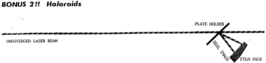 <Introduction> <Equipment> <The Big Beam> <Project 1a: In-line "Gabor" type Holograms> < Project 1b: Off-Axis Holograms> < Project 2: Single Beam Transmission Deep Scene Hologram> <Project 3: Division of Amplitude Hologram> <Project 4: Pseudo-Achromat Transfer Hologram> <Project 5: Cylindrical Hologram> <Project 6: Single Beam Reflection Hologram> <Project 7: Image Plane Reflection Hologram> <Bonus Project 1: Diffraction Gratings> <Bonus Project 2: Holoroids>