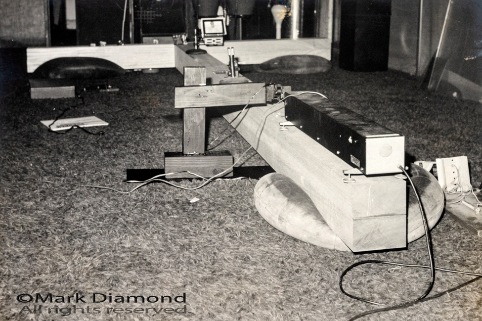 The first incarnation of the Beam utilized only 2 inner tubes, one at each end of it. Here is the first published picture of it, from How to Make Holograms, by Don McNair,Tab Books, 1983, ISBN 0-8306-0109-0 with a Spectra-Physics Model 124 Helium Neon 15 mW laser mounted on it. Don himself took the picture at the party I threw on the Saturday before the 1982 ISDH. The room was full of people, who obliged his request to take an uncluttered picture of it.